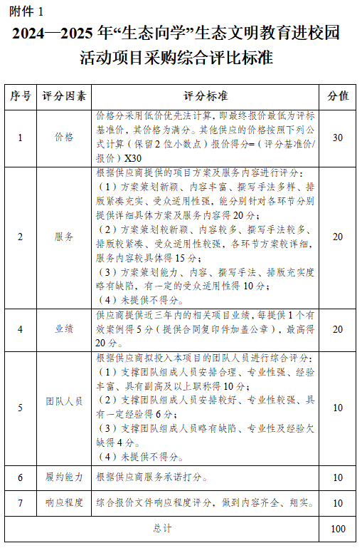 评标方法:南京市生态环境保护科学宣传教育中心负责组织采购,根据采购综合评比标准(附件1),项目采购小组进行采购综合评比打分。