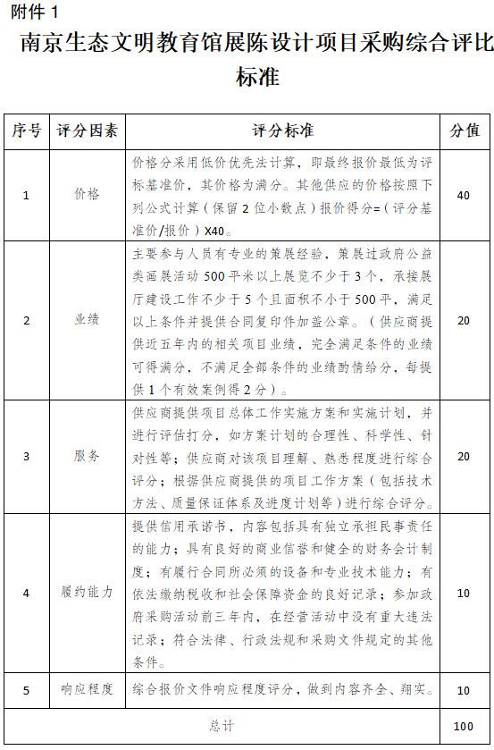 评标方法:南京市生态环境保护宣传教育中心负责组织采购,根据采购综合评比标准(附件1),进行采购综合评比打分。