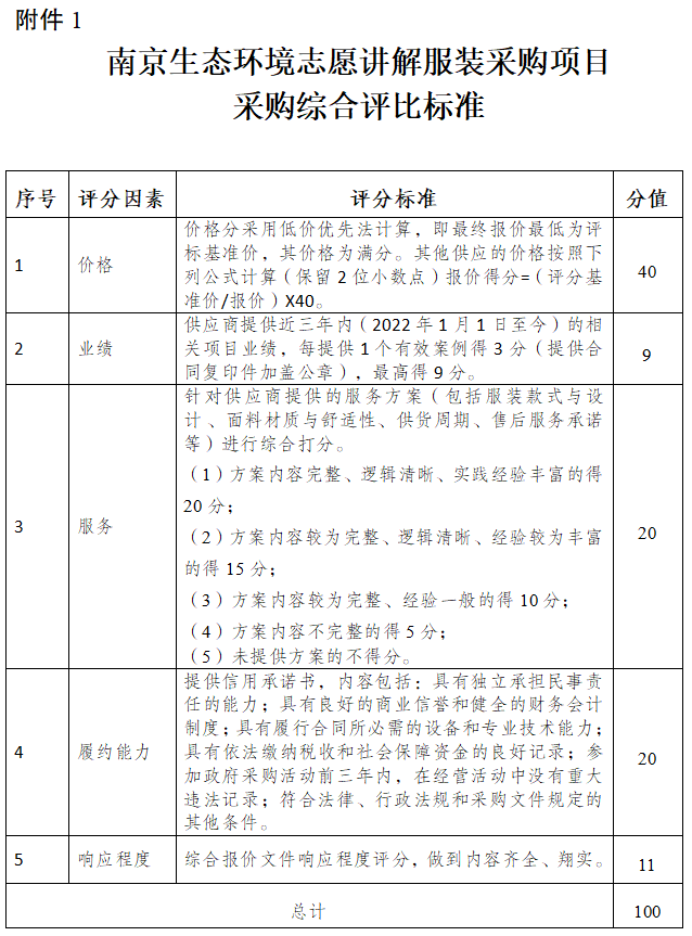 评标方法:南京市生态环境保护宣传教育中心负责组织采购,根据采购综合评比标准(附件1),进行采购综合评比打分。