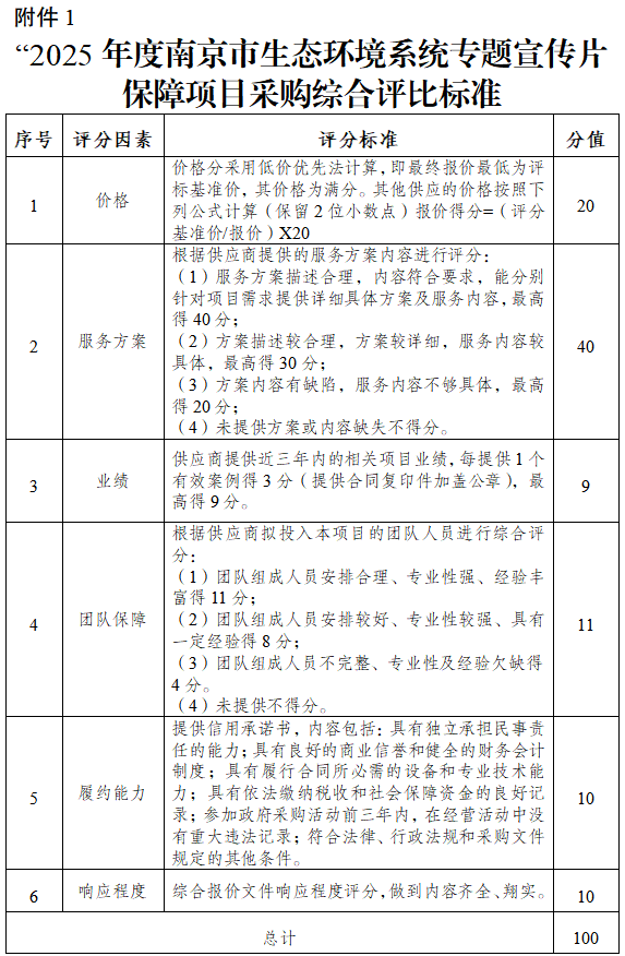 评标方法:南京市生态环境保护宣传教育中心负责组织采购,根据采购综合评比标准(附件1),进行采购综合评比打分。