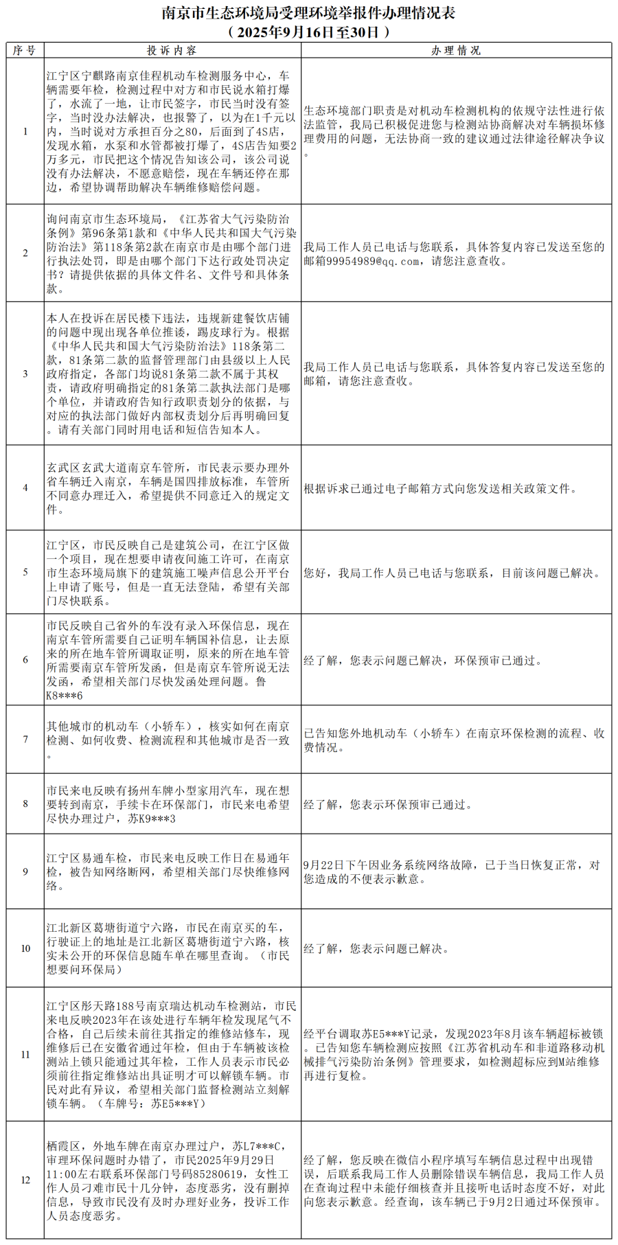 南京市生态环境局受理环境举报件办理情况表 (2025年9月16日至30日)
