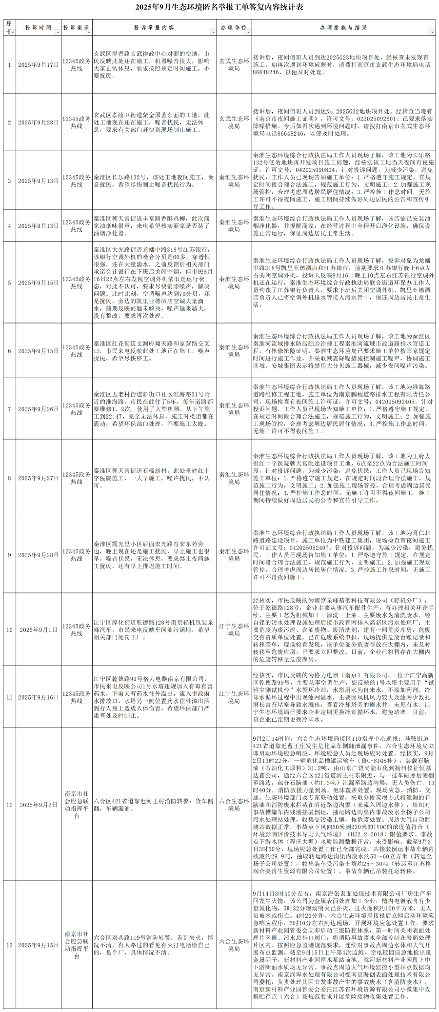 2025年9月1日至9月30日,南京市生态环境系统共办理群众匿名投诉举报生态环境信访事项39件,已按照相关法律法规进行调查处理。现将符合公开要求的13件投诉有关情况进行公开,请予以监督。