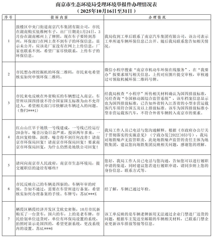 南京市生态环境局受理环境举报件办理情况表 (2025年10月16日至31日)