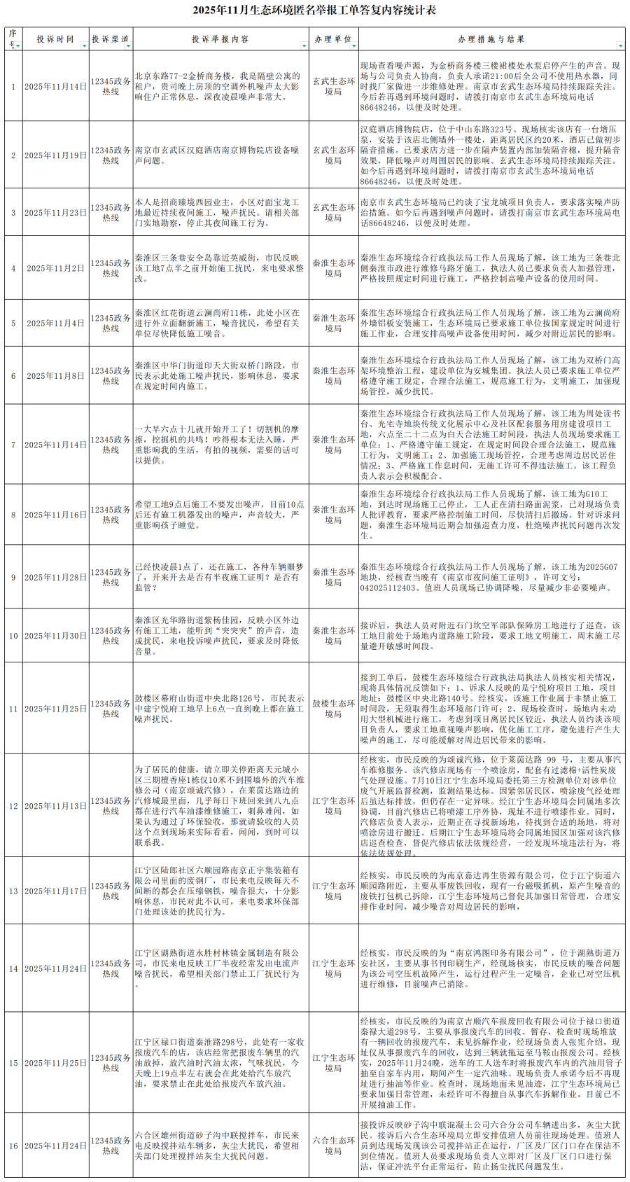 2025年11月1日至11月30日,南京市生态环境系统共办理群众匿名投诉举报生态环境信访事项41件,已按照相关法律法规进行调查处理。现将符合公开要求的16件投诉有关情况进行公开,请予以监督。