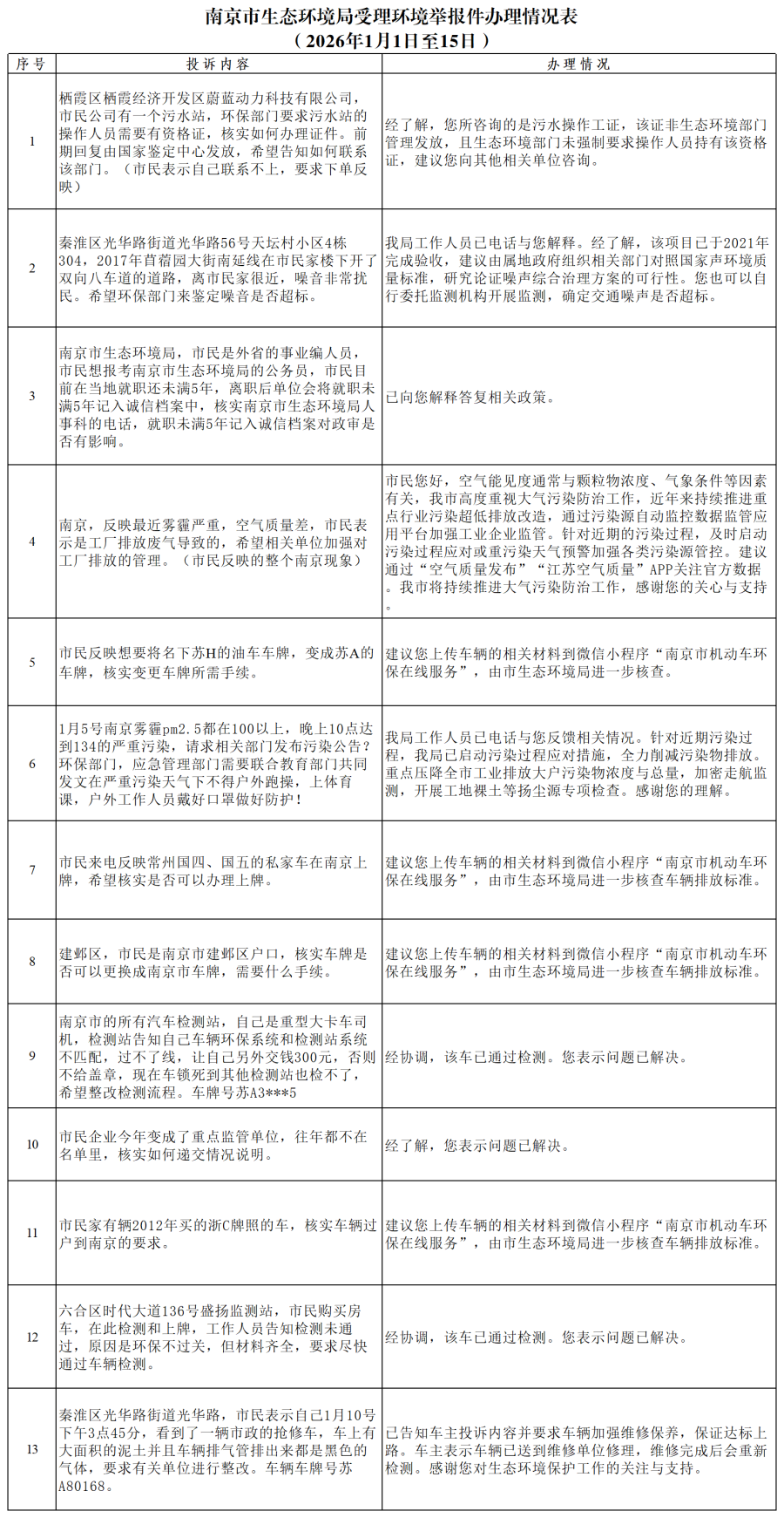南京市生态环境局受理环境举报件办理情况表 (2026年1月1日至15日)