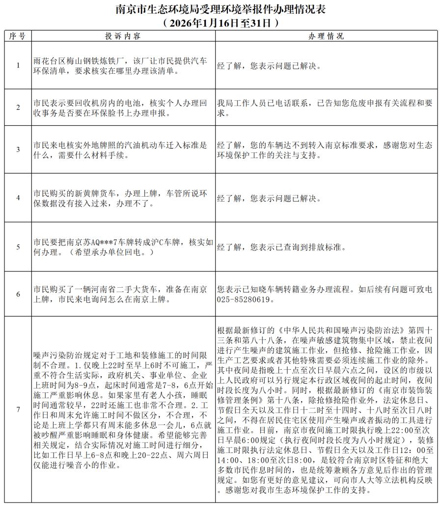 南京市生态环境局受理环境举报件办理情况表 (2026年1月16日至31日)