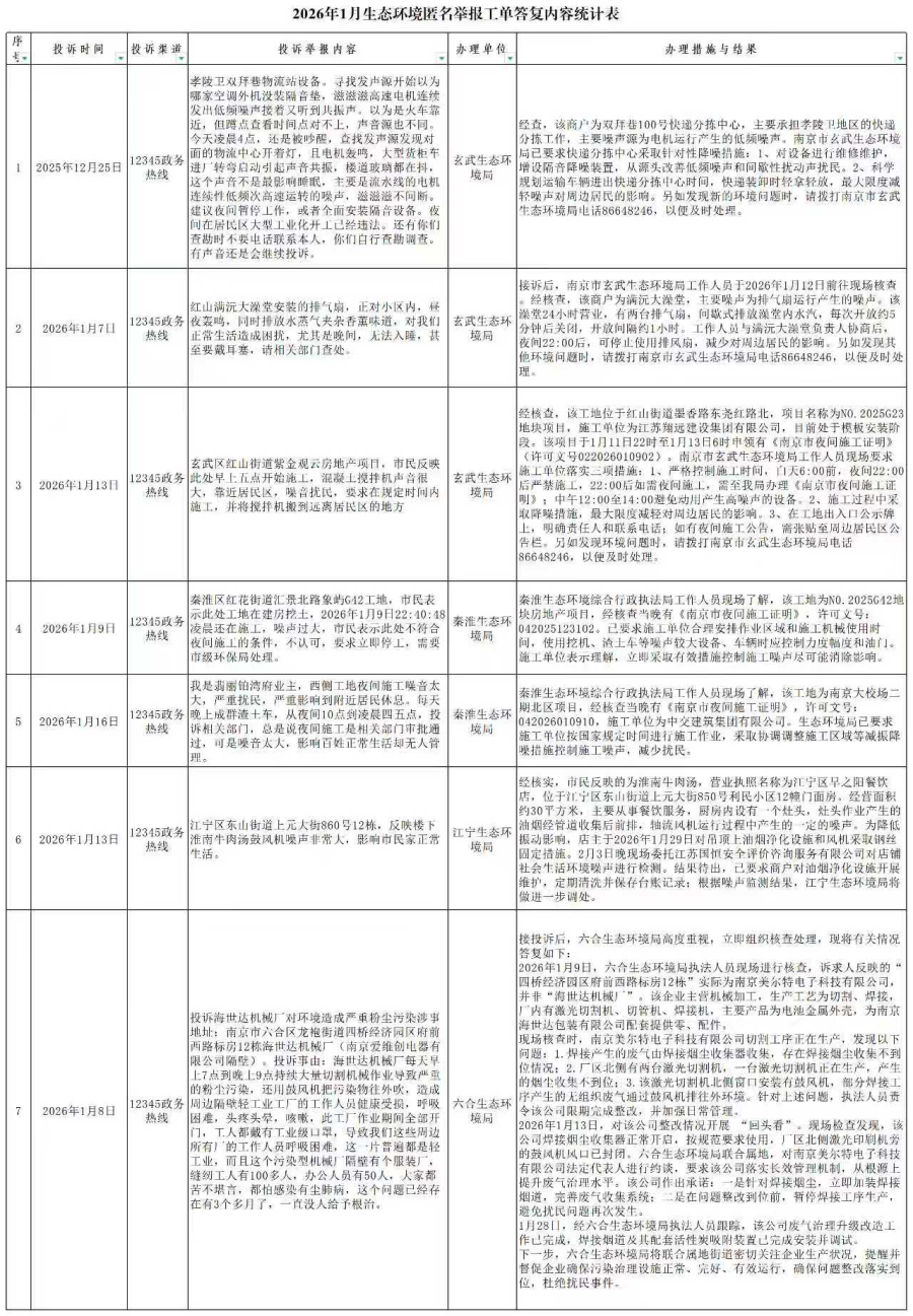 2026年1月1日至1月31日,南京市生态环境系统共办理群众匿名投诉举报生态环境信访事项24件,已按照相关法律法规进行调查处理。现将符合公开要求的7件投诉有关情况进行公开,请予以监督。