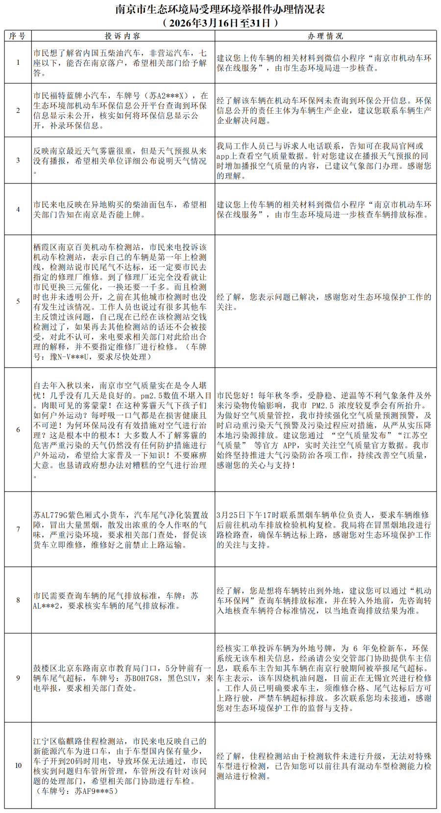 南京市生态环境局受理环境举报件办理情况表 (2026年3月16日至31日)