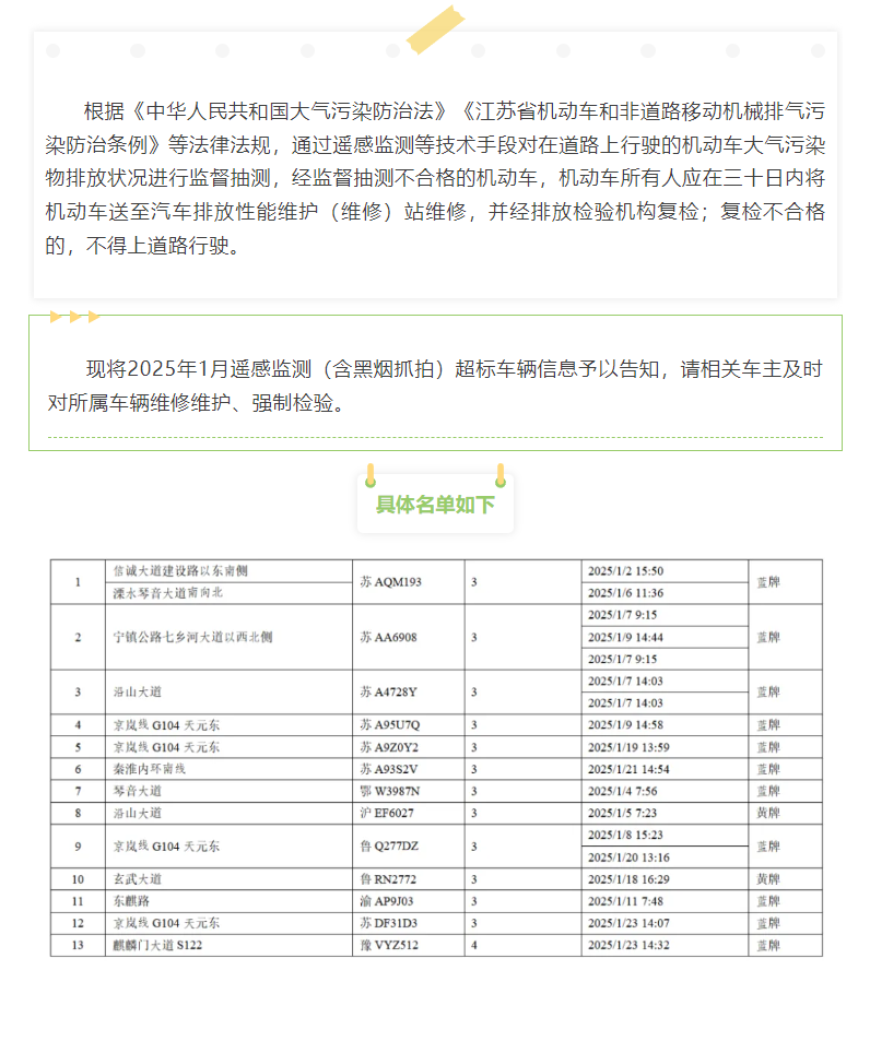 2025年1月黑烟抓拍涉嫌超标车辆信息