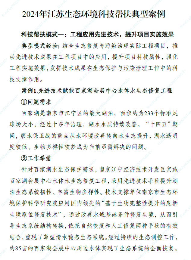 近期,江苏省生态环境厅印发了2024年江苏生态环境科技帮扶典型案例,南京市生态环境保护科学研究院(以下简称“市环科院”)技术支撑的《先进技术赋能百家湖会展中心水体水生态修复工程》在众多优秀案例中脱颖而出,成功入选“工程应用先进技术,提升项目实施效”典型案例。这既是对南京市在水环境治理方面取得成绩的认可,更是市环科院以科技赋能百家湖水生态环境治理的充分肯定。