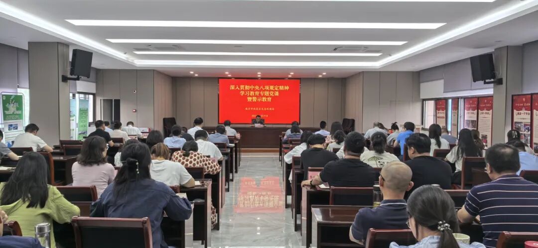 为扎实推进深入贯彻中央八项规定精神学习教育走深走实,切实增强党员干部纪律意识、规矩意识,筑牢拒腐防变思想防线,6月19日,雨花台生态环境局党组书记、局长许颐欣以“锲而不舍落实中央八项规定精神,锻造新时代环保铁军过硬作风”为主题,为全局党员干部讲授了一堂深刻而务实的中央八项规定精神学习教育专题党课。全局全体党员干部参加会议。