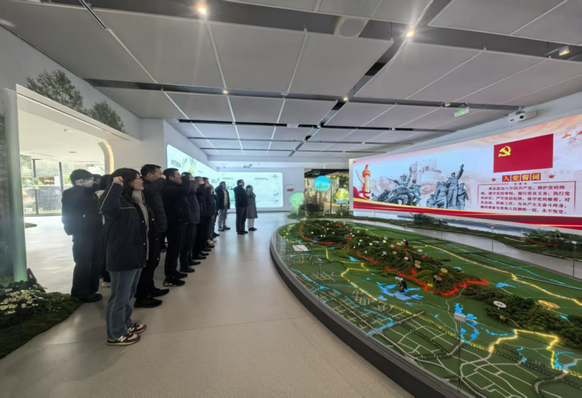 活动首站来到老山生物多样性观测站,这座于2025年5月正式启用的南京市首个森林生态系统观测站,正以科技力量守护着野生动植物的“基因库”。观测站内,技术员通过电脑实时观测监控区域动态。当看到屏幕上自动识别的梅花鹿、野猪、獐等野生动物动态时,大家深切体会到生态监测技术革新为生物多样性保护带来的有力支撑,对“科技赋能生态保护”有了更直观的认识。在多功能厅的鲜红党旗下,全体党员重温入党誓词,以铿锵誓言映照初心,进一步强化了立足岗位推进生态环境保护的责任担当。