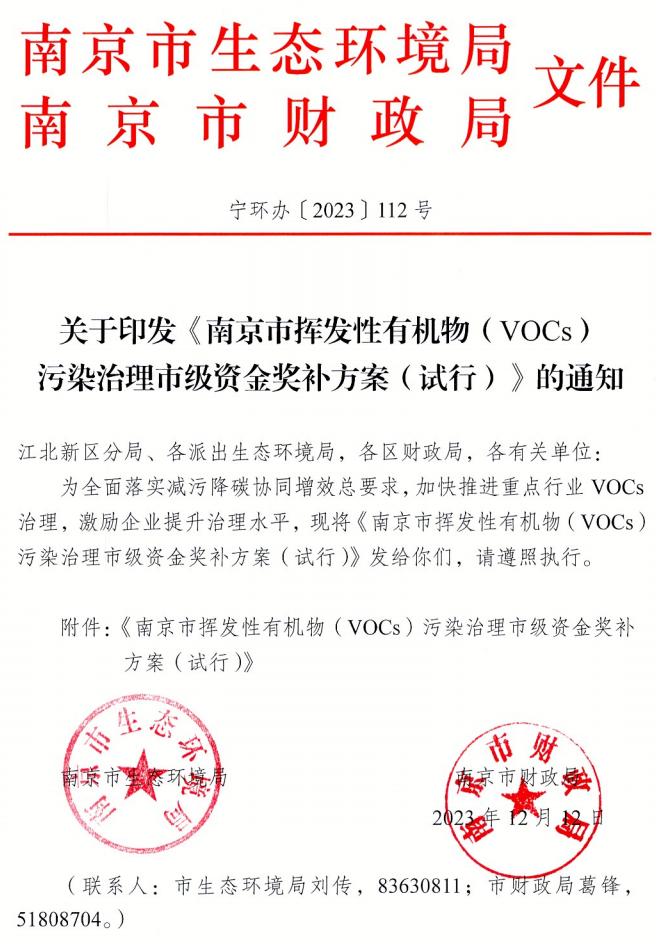 关于印发《南京市挥发性有机物(VOCs)污染治理市级资金奖补方案(试行)》的通知