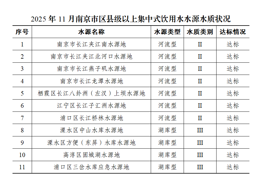 2025年11月,江苏省南京环境监测中心监测11个区县级以上在用集中式生活饮用水水源,均属于地表水水源(河流型7个,湖库型4个)。