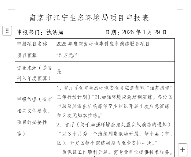 江宁生态环境局2026年度突发环境事件应急演练服务项目公示