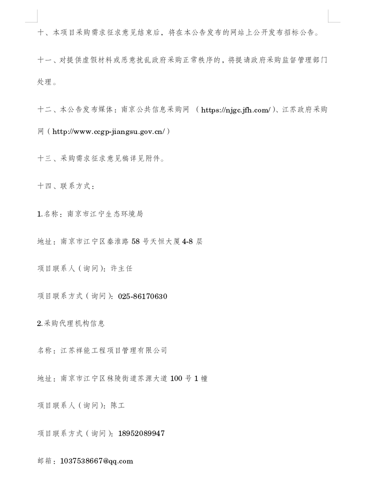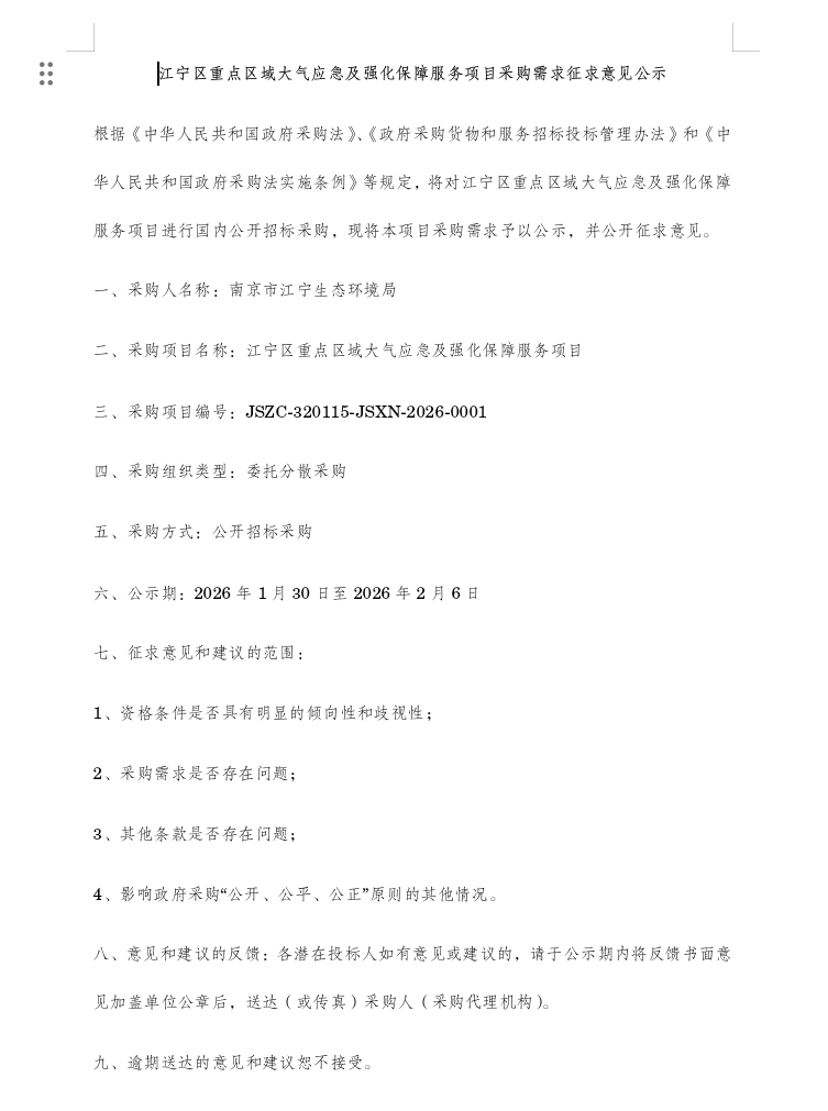 江宁区重点区域大气应急及强化保障服务项目采购需求征求意见公示
