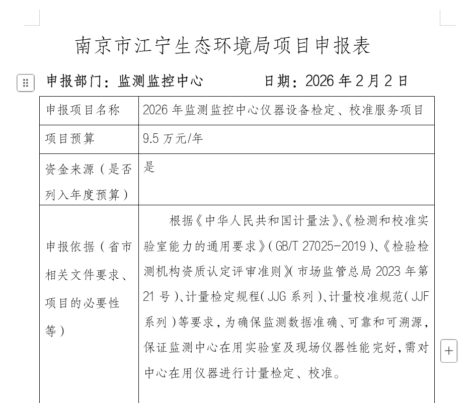 2026年江宁监测监控中心仪器设备检定、校准服务项目意向公示