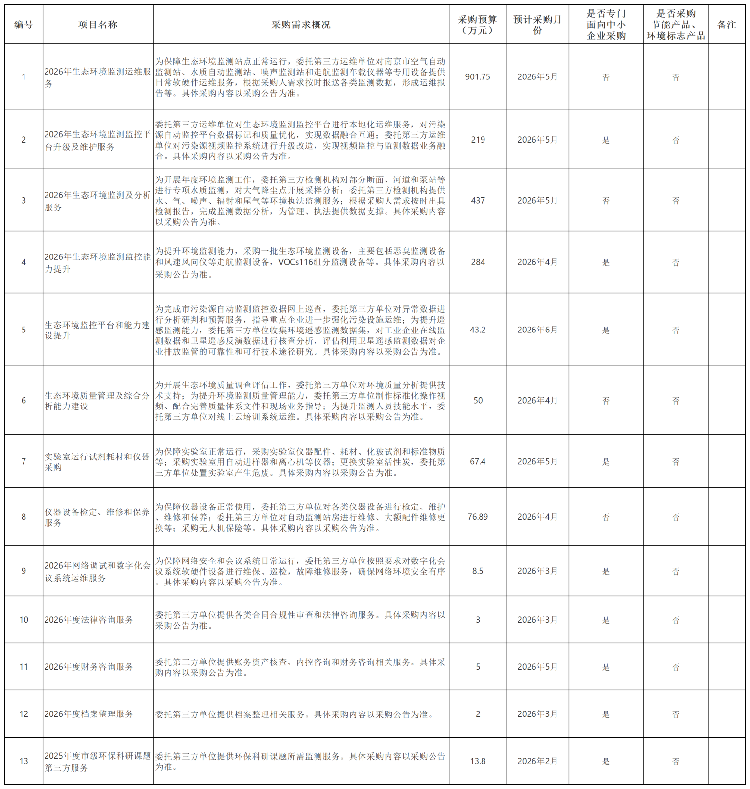 为便于供应商及时了解政府采购信息,根据《江苏省财政厅关于做好政府采购意向公开工作的通知》等有关规定,现将南京市生态环境监测监控中心2026年2月(第1批)政府采购意向公告如下: