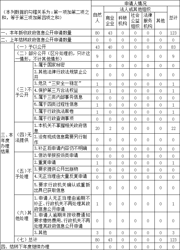2025年我局共收到政府信息公开申请123件,上年度结转0件。已办结的申请件中,公开及部分公开92件,22件因不属于本机关负责公开、信息不存在等原因无法提供,不予公开4件,1件因重复申请不予处理,4件因申请人超期未补正或申请信息不属于政府信息等原因做其他处理,0件结转下年度继续办理。因政府信息公开引发的行政复议12件、行政诉讼3件,未发生复议诉讼纠错情况。